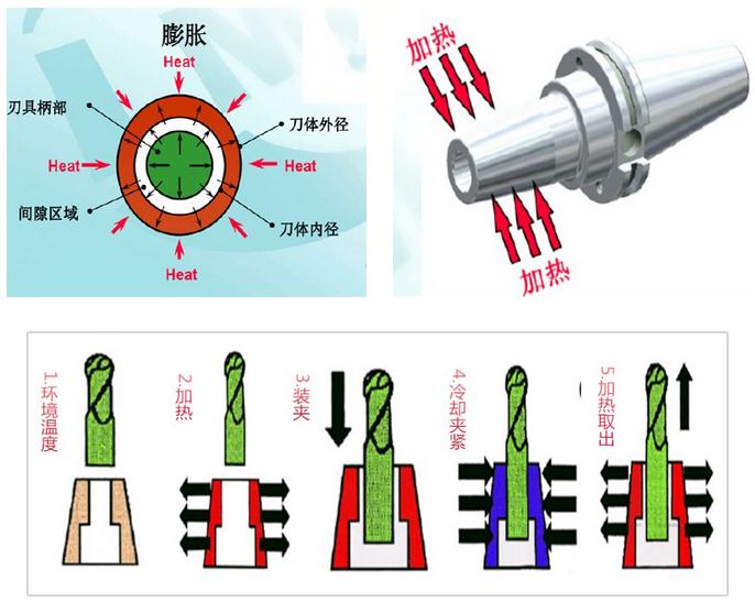 熱脹系統通常是利用熱感應線圈使刀柄的夾持部分在短時間內加熱,使刀柄內徑隨之擴張,此時立即把刀具裝入刀柄內,從而產生很高的徑向夾緊力,將工具牢牢夾持住。因此,熱脹系統是一種刀具與刀柄間不介入熱河物質的熱裝式工具夾緊方法,可以解決高速精度加工中極為重要的平衡,振擺精度及夾緊強度問題.
