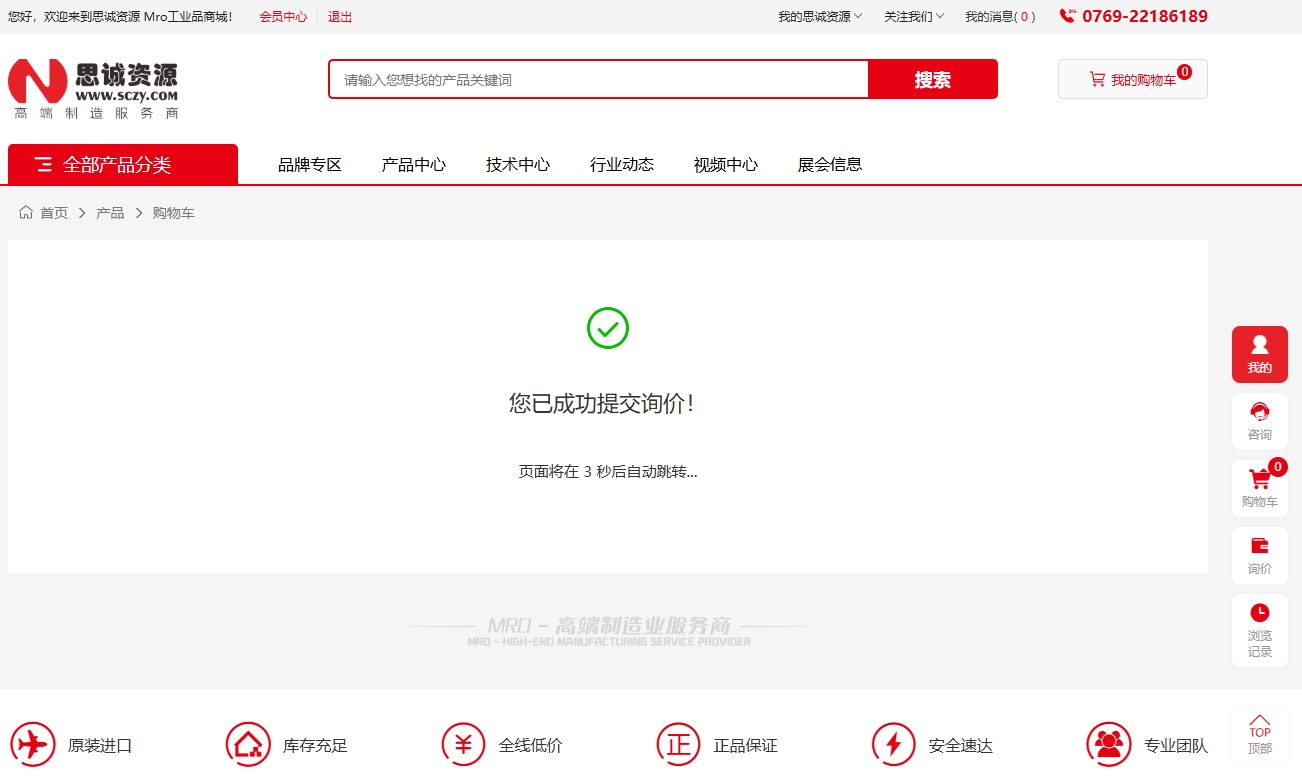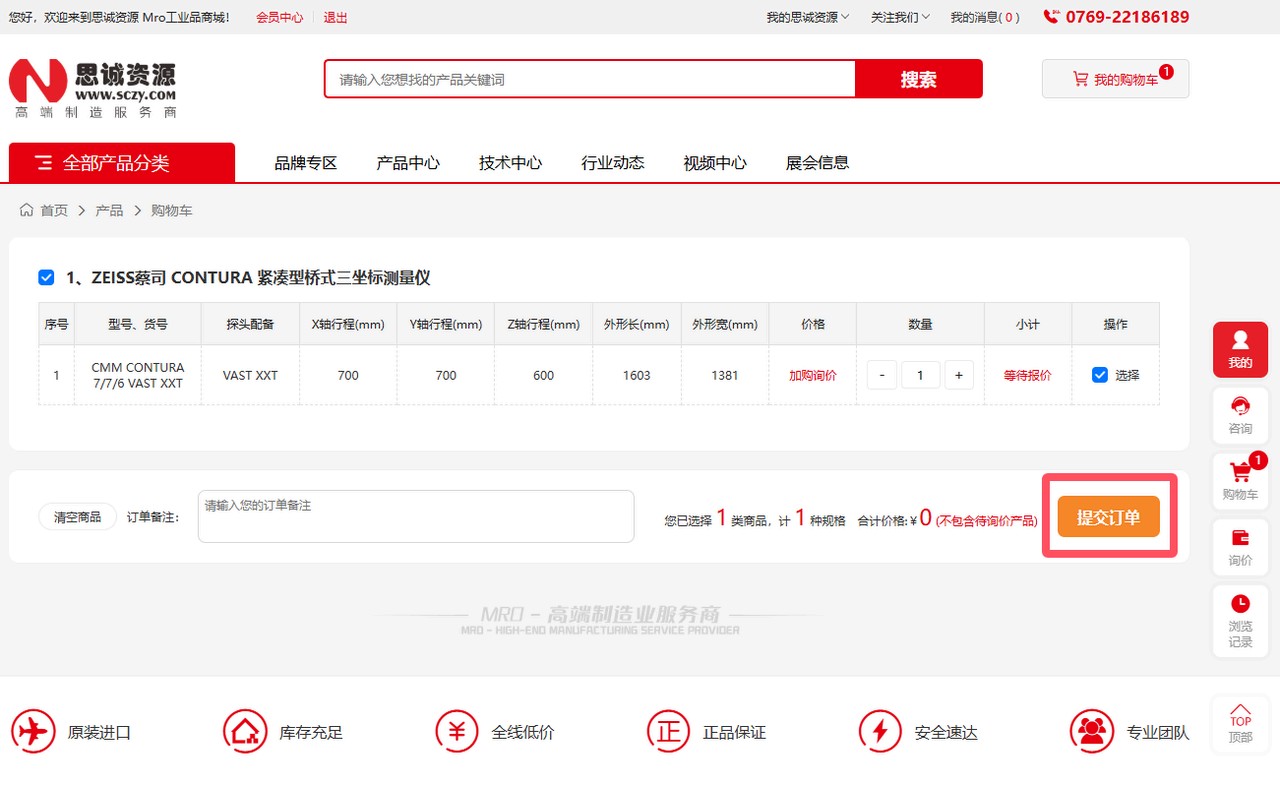 2.2、購物車頁面查看全部待詢價產品,輸入訂單備注(可不填),點擊提交訂單,完成產品詢價