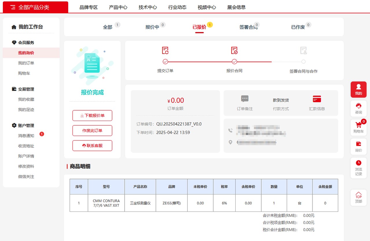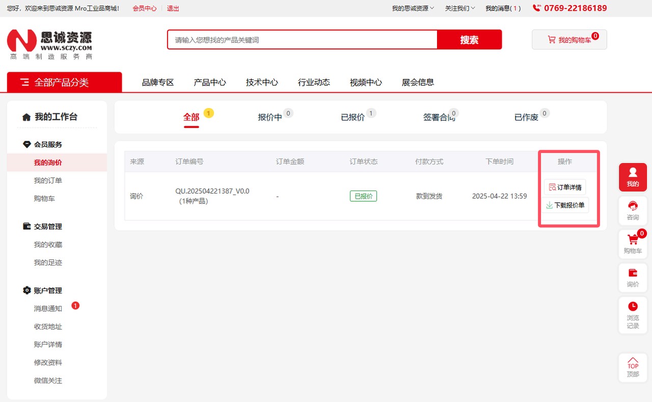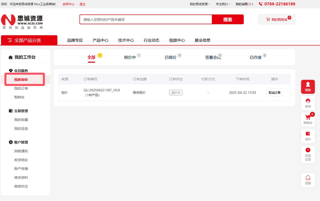 3.1、登錄網站會員中心,點擊左側我的詢價按鈕查看賬號下的全部詢價訂單。報價成功之后會收到站內信、短信、微信(需綁定)等方式通知報價單已經生成。