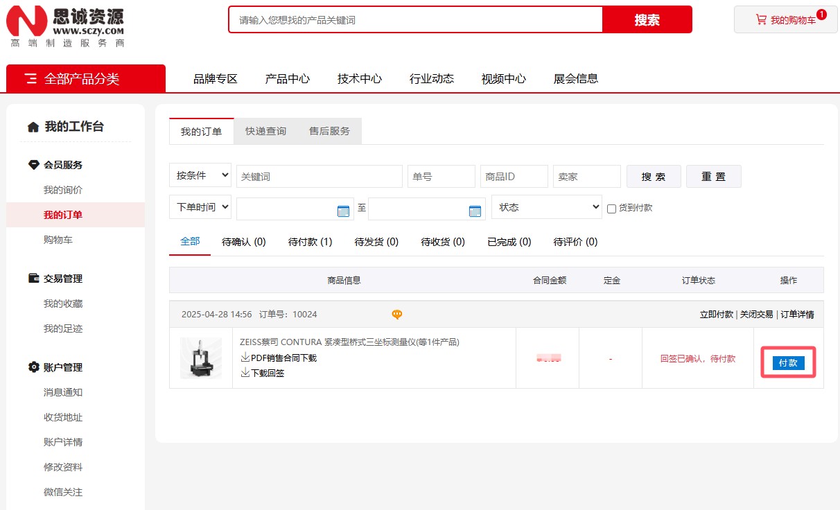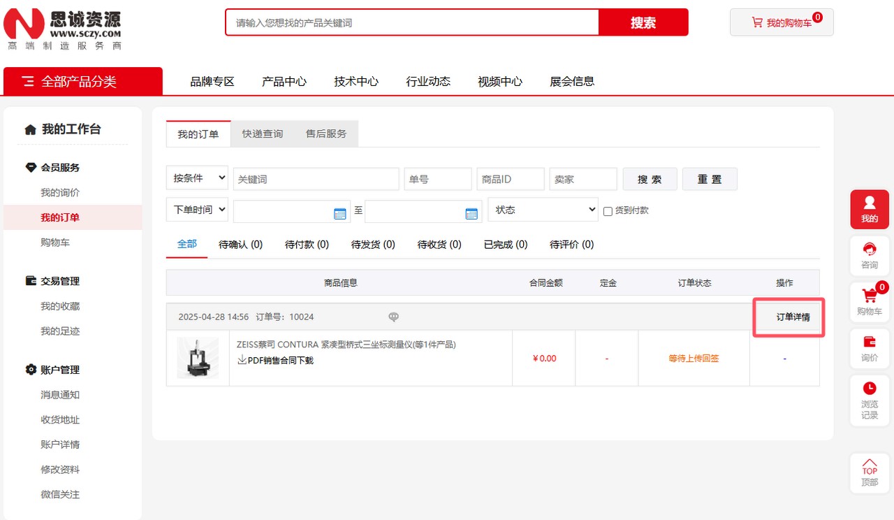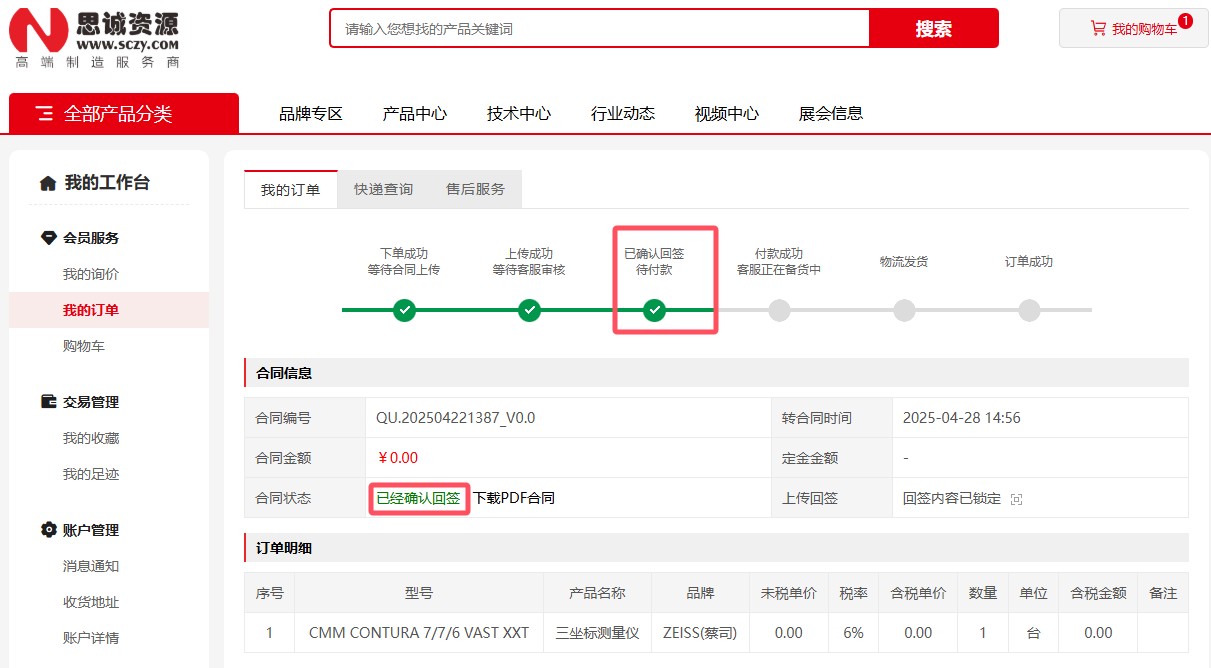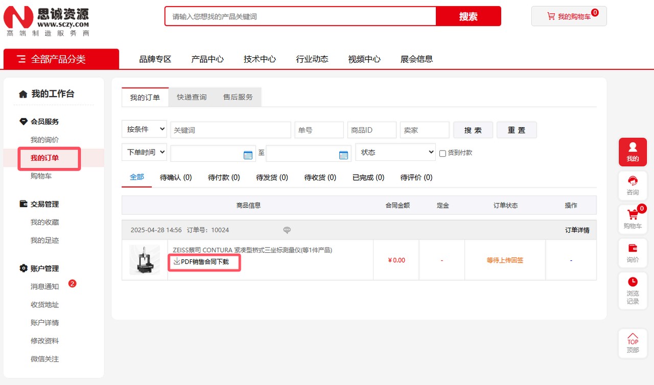 4.1、登錄網站會員中心,點擊左側的 我的訂單 按鈕,即可查看訂單列表,下載PDF合同
