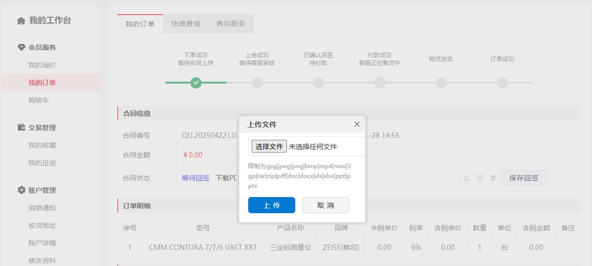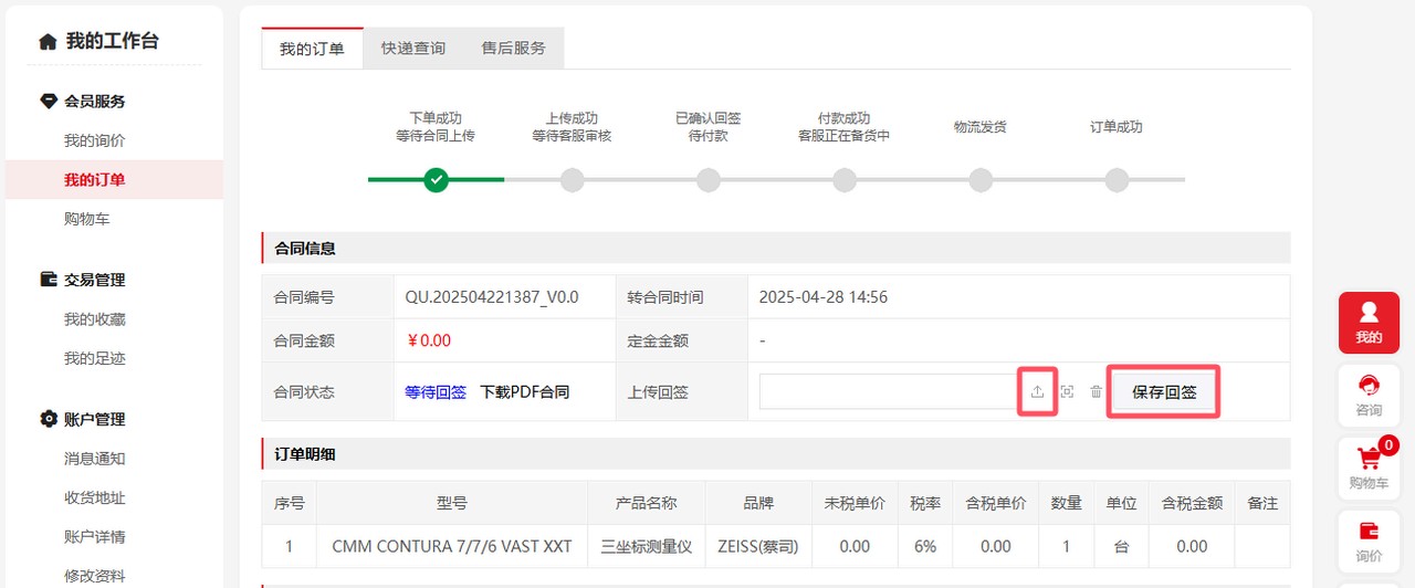 5.2、在訂單詳情頁面的合同信息處上傳合同回簽,上傳成功后點擊保存回簽的按鈕。