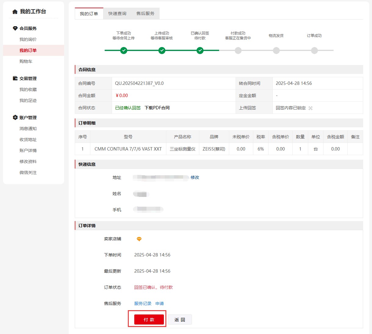 5.3、上傳回簽后需客服會審核回簽是否正確,回簽確認后即可付款