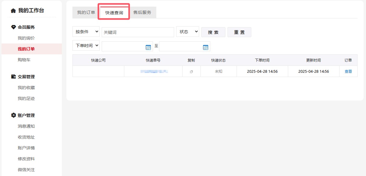 7.1、在我的訂單頁面,點擊頂部的快遞查詢按鈕查看發貨物流信息
