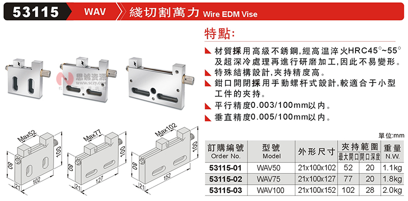 思誠資源為您提供:GIN精展線切割萬力53115/WAV的采購報價、GIN(精展)53115型號參數、規格圖片、PDF畫冊等資料,如您想了解更多關于GIN(精展)正品品牌的其他精密平口鉗資料與產品貨期庫存、行情價格,就在思誠資源MRO商城。