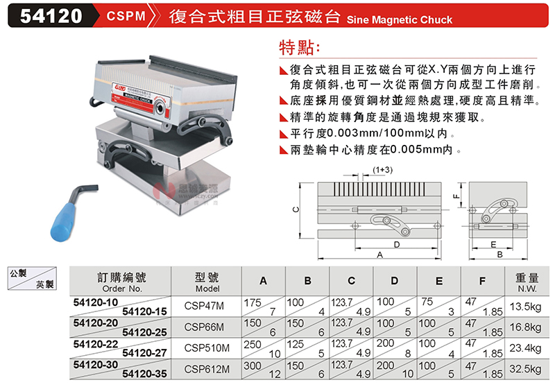 思誠資源為您提供:GIN精展復合式粗目正弦磁臺54120/CSPM的采購報價、GIN(精展)54120型號參數、規格圖片、PDF畫冊等資料,如您想了解更多關于GIN(精展)正品品牌的其他電磁吸盤資料與產品貨期庫存、行情價格,就在思誠資源MRO商城。