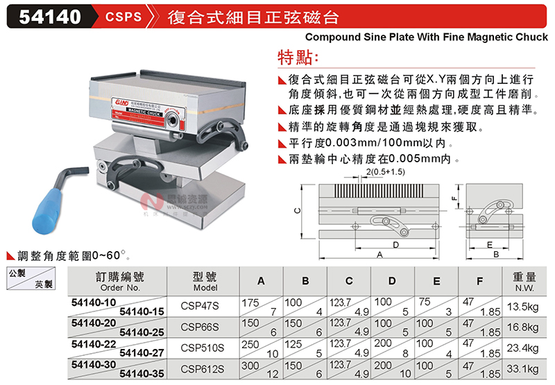 思誠資源為您提供:GIN精展復合式細目正弦磁臺54140/CSPS的采購報價、GIN(精展)54140型號參數、規格圖片、PDF畫冊等資料,如您想了解更多關于GIN(精展)正品品牌的其他電磁吸盤資料與產品貨期庫存、行情價格,就在思誠資源MRO商城。