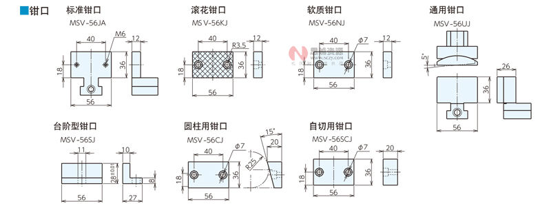 | 類型 | 鉗口張開度 (均等) | 重量kg | MSV (無鋸齒) | MSV-S (帶鋸齒) | MSV-K (鍵槽規格) | |||