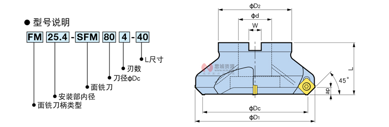 | 刀徑 φDc | 型 號 | 有效切削刃長 ap | φD1 | φd | φD2 | L | W | 刃數(shù) | 質(zhì)量 (kg) |