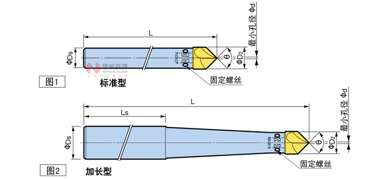 | 倒角 角度θ | 型號 | 圖 | φDs | φD2 | φd | L | Ls | 對應刀片型號 | 備用鎖緊旋鈕 (另售) |