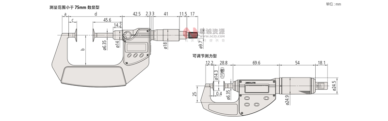 | 數顯型 (LCD) | 369-250 | 0 - 25mm | 0.001mm | ±4μm | ?20 | 1μm | 4μm | — |