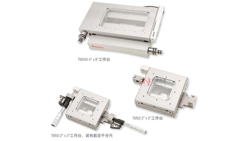 TM200工作臺手動驅動裝置為帶導向螺桿的手輪,TM50工作臺為2"(50mm)測微頭