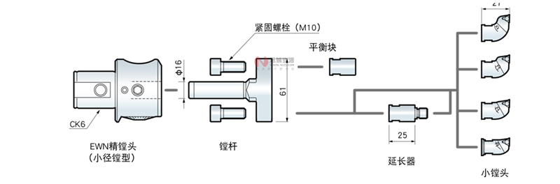 | 加工范圍φd | EWN 精鏜頭 | 鏜桿 | 平衡塊 | 延長器 | 小鏜頭 | 對應 刀片 |