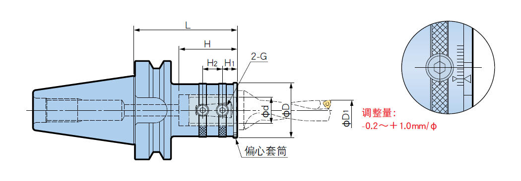 | BIG-PLUS BBT基礎柄 型號 | φd | φD | L | H | H1 | H2 | G | 質量 (kg) | 適用鉆頭直徑 (φD1) |