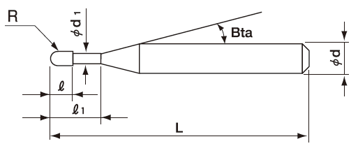 | 型號(hào) | 球半徑 R | 有效長(zhǎng) R1 | 刃長(zhǎng) R | 首徑 φd1 | 柄錐角度 Bta | 全長(zhǎng) L | 柄徑 φd | 工件勾配角對(duì)應(yīng)的實(shí)際有效長(zhǎng) | ||||