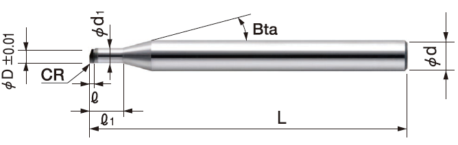 | 型號 | 外徑 φD | 圓角半徑 CR | 有效長 R1 | 刃長 R | 首徑 φd1 | 柄錐角度 Bta | 全長 L | 柄徑 φd |