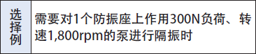 ■泵產生的振動頻率為1,800轉/60秒=30Hz。因此,防振座應選擇固有頻率為30Hz / 2 = 15Hz以下的類型。