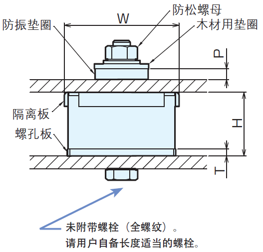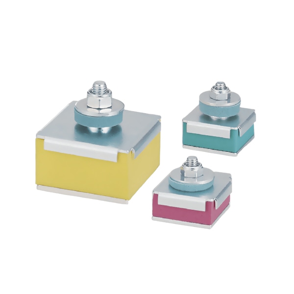 ●中心開有螺栓孔,通過螺栓進(jìn)行設(shè)置,可限制裝載物的擺動(dòng)。另外,附帶防振墊圈,可減緩受到限制后的沖擊。