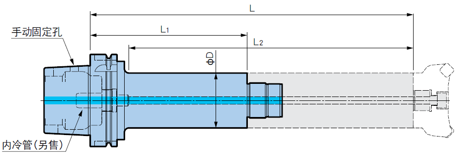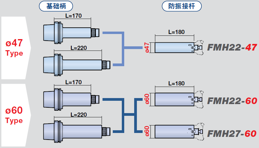 一把防振接桿(BBT/HSK刀柄共通)可以用于不同長度的基礎(chǔ)柄。