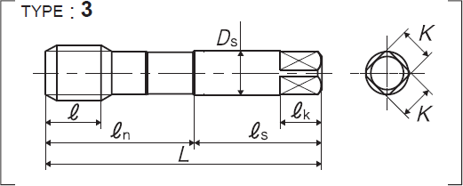 | 全長 | 吃入部+完全螺紋部的長度 | 螺紋部長 | 頸下長 | 柄部長 | 柄徑 | 四角部寬 | 四角部長 |