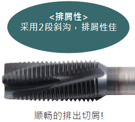 ●采用獨創的溝型,在中速范圍攻牙穩定,且排屑排出順暢。加工出的螺紋表面平滑度提升。