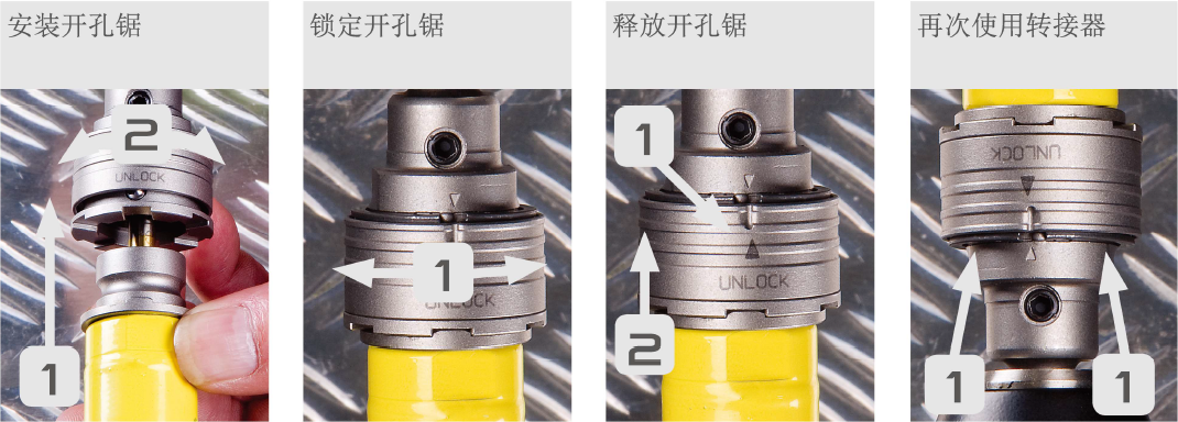 快速更換不同尺寸和類型的開孔鋸,無需工具,輕松脫芯和擴(kuò)孔。