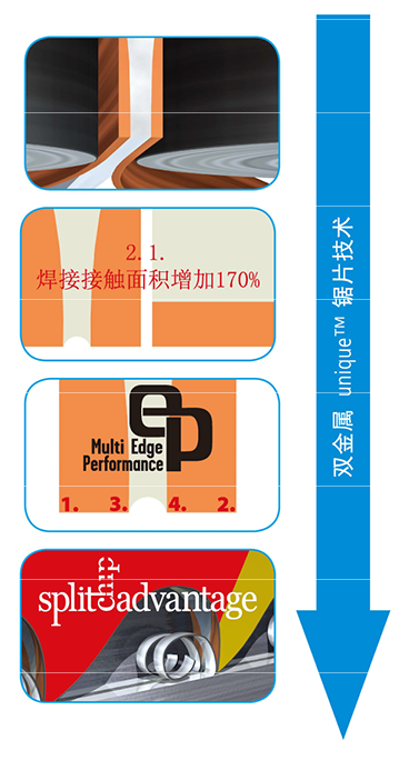 -對鋸齒破損和斷裂的抵抗力大幅提高。由于采用固態擴散結合工藝,Unique?刀片比標準雙金屬刀片具有170%以上的焊 接接觸面積。這能夠確保鋸齒十分堅固。