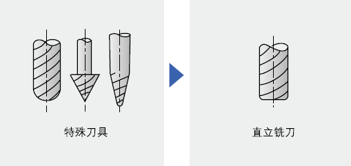 與球頭銑刀的點接觸切削相比較 , 通過在直立部分上的側刀 切削 , 可大幅度縮短加工時間。同時 , 高剛性短刀具的使用, 可避開干擾的角度進行切削。