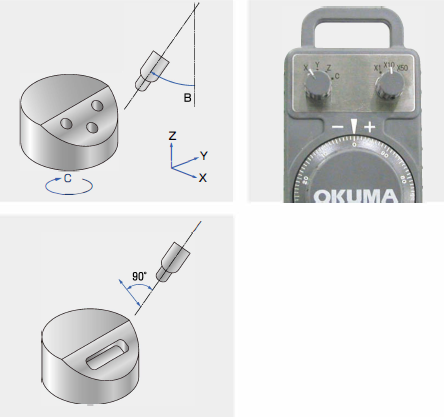 在傾斜刀具主軸的狀態下, 在軸方向以及軸上沿直角的方向可以進行手輪進給。 利用該功能通過脈沖手輪可以簡單地進行在傾斜面上開孔, 退刀或傾斜面的平面加工。