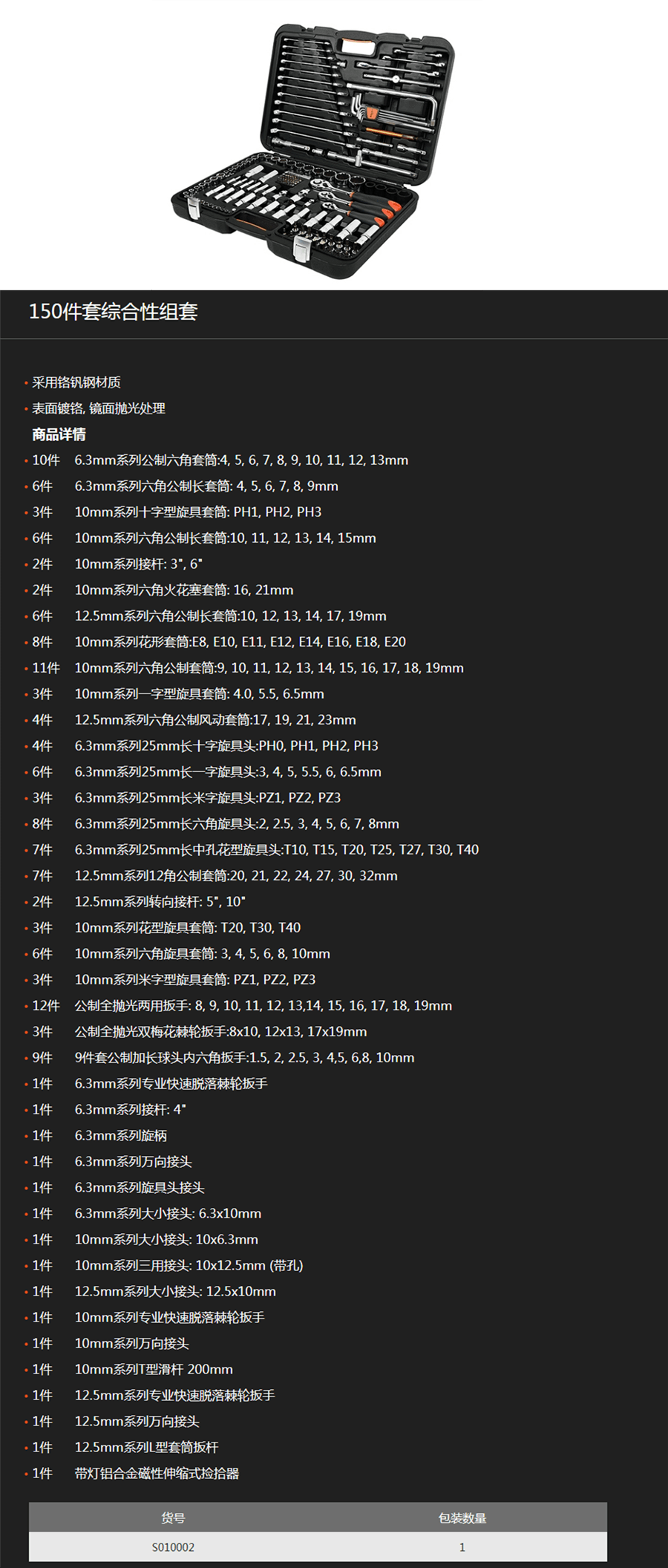 思誠資源為您提供:SHEFFIELD鋼盾 S010002 150件套綜合性組套套裝的采購報價、SHEFFIELD(鋼盾)S010002型號參數(shù)、規(guī)格圖片、PDF畫冊等資料,如您想了解更多關(guān)于SHEFFIELD(鋼盾)正品品牌的其他機(jī)工工具資料與產(chǎn)品貨期庫存、行情價格,就在思誠資源MRO商城。