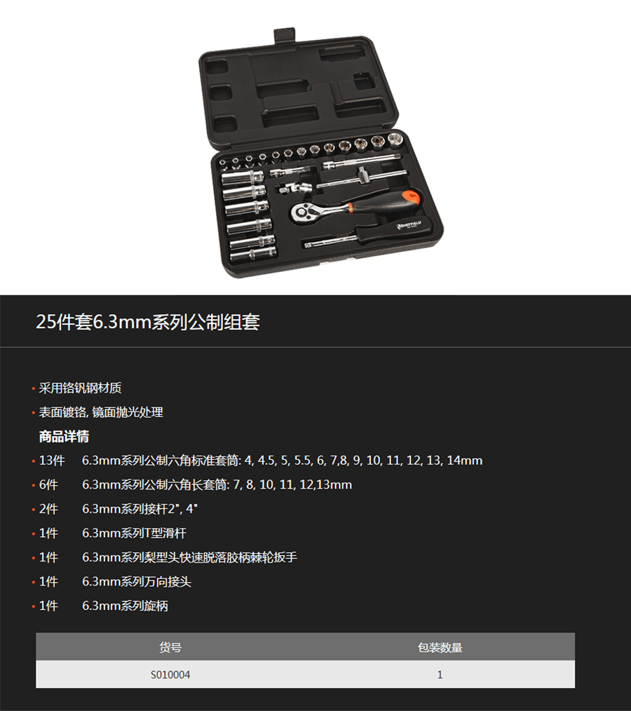 思誠資源為您提供:SHEFFIELD鋼盾 S010004 25件套6.3mm系列公制組套套裝的采購報價、SHEFFIELD(鋼盾)S010004型號參數、規格圖片、PDF畫冊等資料,如您想了解更多關于SHEFFIELD(鋼盾)正品品牌的其他機工工具資料與產品貨期庫存、行情價格,就在思誠資源MRO商城。