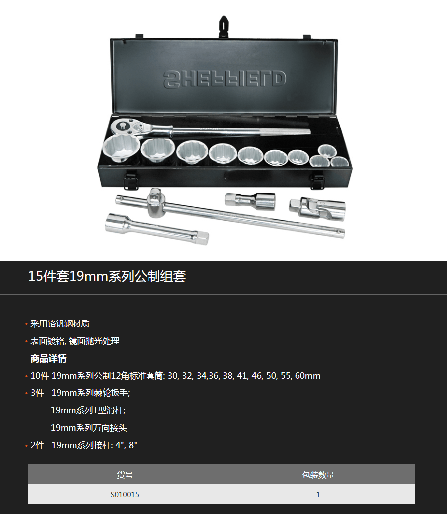 思誠資源為您提供:SHEFFIELD鋼盾 S010015 15件套19mm系列公制組套套裝的采購報價、SHEFFIELD(鋼盾)S010015型號參數、規格圖片、PDF畫冊等資料,如您想了解更多關于SHEFFIELD(鋼盾)正品品牌的其他機工工具資料與產品貨期庫存、行情價格,就在思誠資源MRO商城。