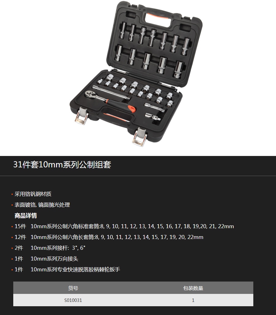 思誠資源為您提供:SHEFFIELD鋼盾 S010031 31件套10mm系列公制組套套裝的采購報(bào)價(jià)、SHEFFIELD(鋼盾)S010031型號(hào)參數(shù)、規(guī)格圖片、PDF畫冊(cè)等資料,如您想了解更多關(guān)于SHEFFIELD(鋼盾)正品品牌的其他機(jī)工工具資料與產(chǎn)品貨期庫存、行情價(jià)格,就在思誠資源MRO商城。
