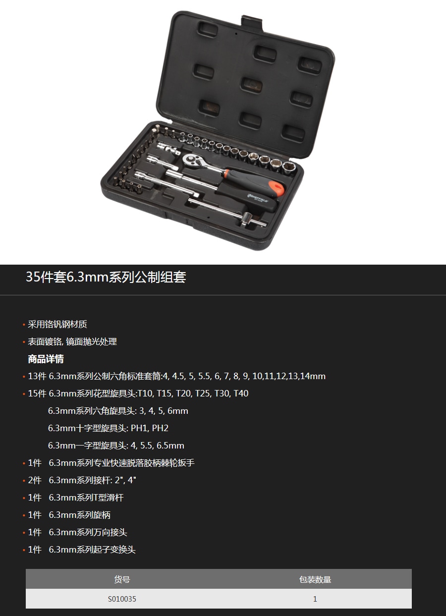 思誠資源為您提供:SHEFFIELD鋼盾 S010035 35件套6.3mm系列公制組套套裝的采購報價、SHEFFIELD(鋼盾)S010035型號參數、規格圖片、PDF畫冊等資料,如您想了解更多關于SHEFFIELD(鋼盾)正品品牌的其他機工工具資料與產品貨期庫存、行情價格,就在思誠資源MRO商城。