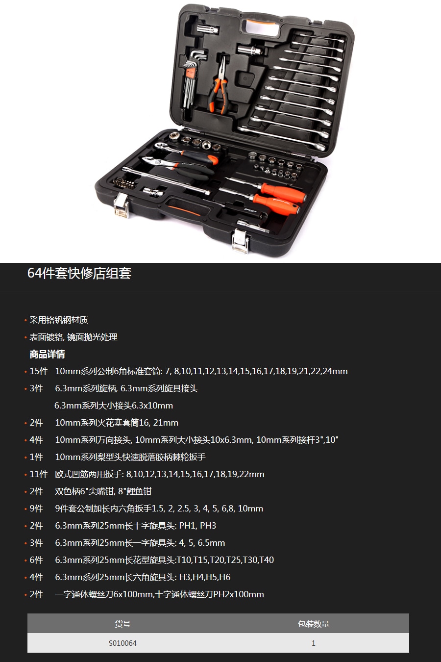 思誠資源為您提供:SHEFFIELD鋼盾 S010064 64件套快修店組套套裝的采購報價、SHEFFIELD(鋼盾)S010064型號參數、規格圖片、PDF畫冊等資料,如您想了解更多關于SHEFFIELD(鋼盾)正品品牌的其他機工工具資料與產品貨期庫存、行情價格,就在思誠資源MRO商城。