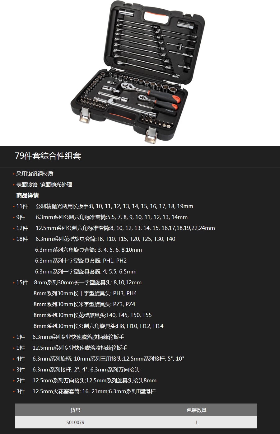 思誠資源為您提供:SHEFFIELD鋼盾 S010079 79件套綜合性組套套裝的采購報價、SHEFFIELD(鋼盾)S010079型號參數、規(guī)格圖片、PDF畫冊等資料,如您想了解更多關于SHEFFIELD(鋼盾)正品品牌的其他機工工具資料與產品貨期庫存、行情價格,就在思誠資源MRO商城。