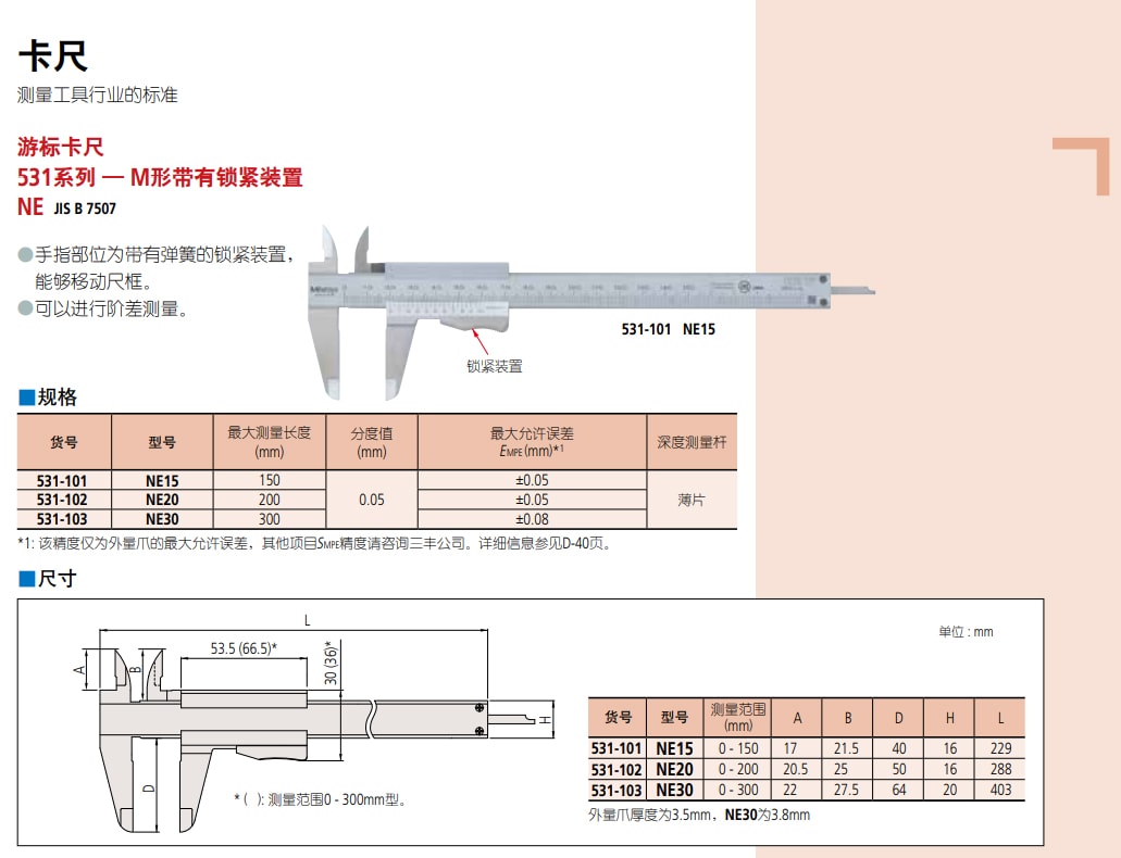 思誠資源為您提供:Mitutoyo三豐 531系列 M型附帶鎖緊裝置游標卡尺工具的采購報價、Mitutoyo(三豐)531系列型號參數、規格圖片、PDF畫冊等資料,如您想了解更多關于Mitutoyo(三豐)正品品牌的其他卡尺資料與產品貨期庫存、行情價格,就在思誠資源MRO商城。