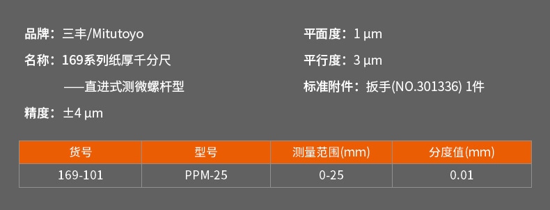 思誠資源為您提供:Mitutoyo三豐 169系列 PPM-B 直進式紙厚千分尺的采購報價、Mitutoyo(三豐)169系列型號參數、規格圖片、PDF畫冊等資料,如您想了解更多關于Mitutoyo(三豐)正品品牌的其他千分尺資料與產品貨期庫存、行情價格,就在思誠資源MRO商城。