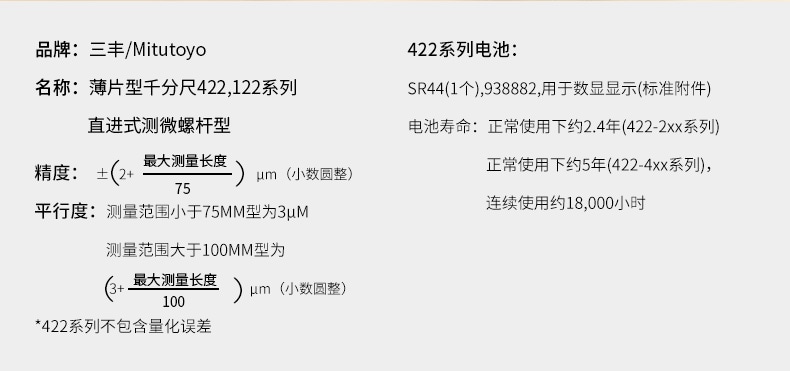 思誠資源為您提供:Mitutoyo三豐 422系列 數顯薄片型千分尺的采購報價、Mitutoyo(三豐)422系列型號參數、規格圖片、PDF畫冊等資料,如您想了解更多關于Mitutoyo(三豐)正品品牌的其他千分尺資料與產品貨期庫存、行情價格,就在思誠資源MRO商城。
