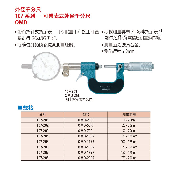 Mitutoyo三豐 107系列 可帶表式外徑千分尺