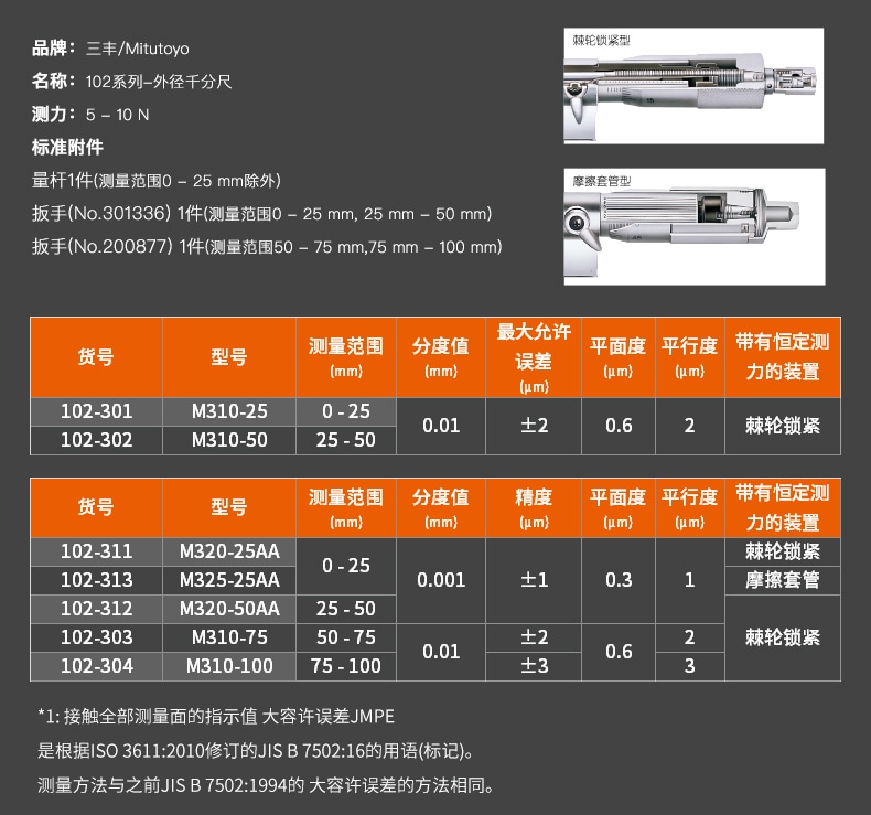 | 102-302(25-50MM) | 0.002 | 硬質合金測量面 | 0.01 | 25-50 | 加購詢價 |
