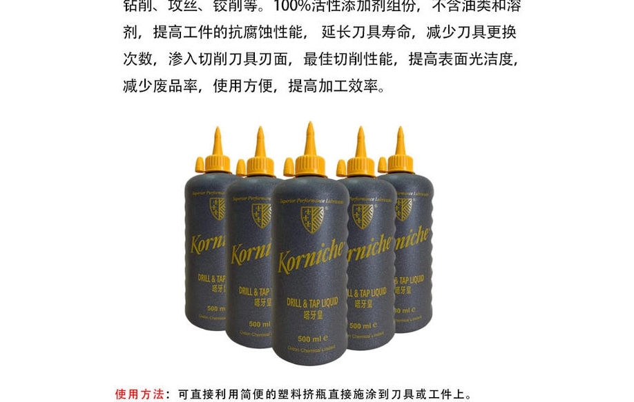 思誠資源為您提供:KORNICHE比爾 液體金屬切削加工潤滑劑嗒牙皇 500ml的采購報價、比爾(KORNICHE)DRILL AND TAP FLUID型號參數、規格圖片、PDF畫冊等資料,如您想了解更多關于比爾(KORNICHE)正品品牌的其他切削液資料與產品貨期庫存、行情價格,就在思誠資源MRO商城。