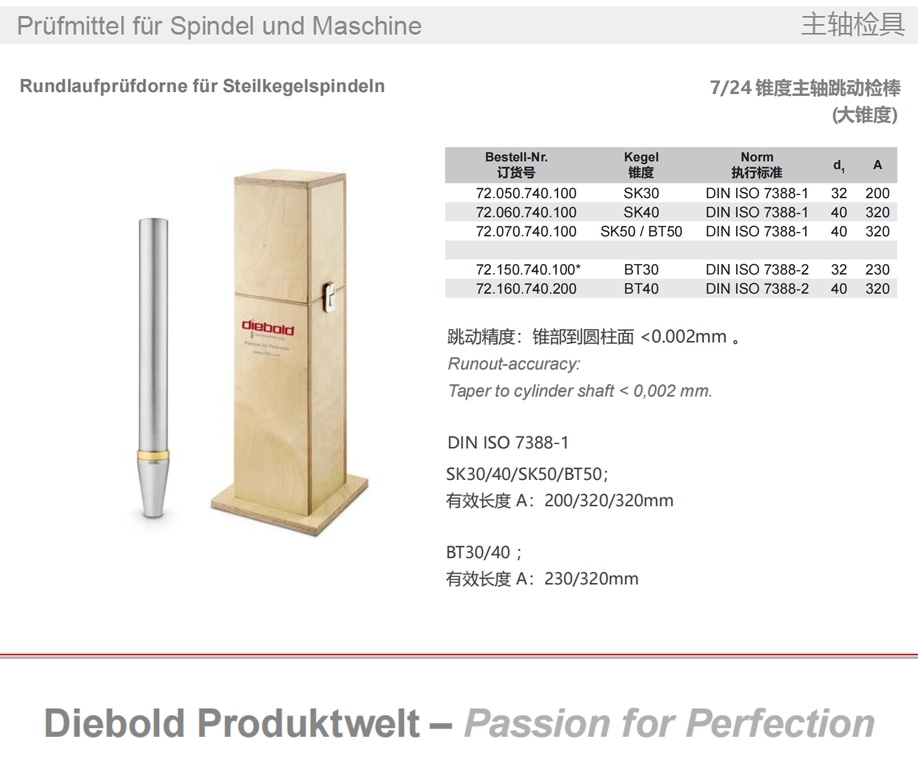 思誠資源為您提供:Diebold戴博 7/24錐度主軸跳動檢棒 大錐度主軸測試棒的采購報價、Diebold(戴博)Runout Test Arbors for 7/24 Taper Spindles型號參數、規格圖片、PDF畫冊等資料,如您想了解更多關于Diebold(戴博)正品品牌的其他主軸檢具資料與產品貨期庫存、行情價格,就在思誠資源MRO商城。