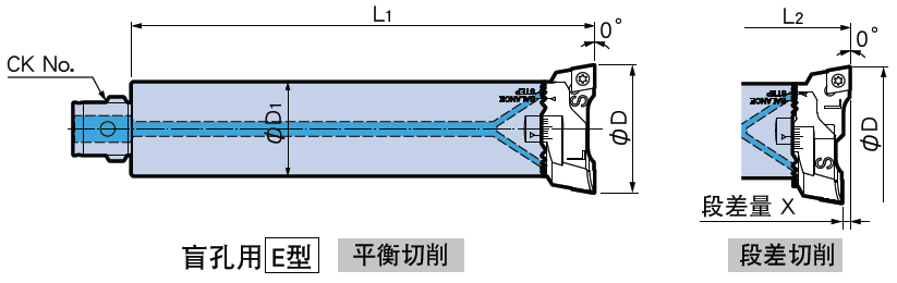 | 加工范圍 φD | 鏜頭型號 | 對應基礎柄 CK No. | 對應 刀片座 | 對應 刀片 | φD1 | L1 | L2 | 段差量 X | 對應緊固螺栓 組合(備用) | 對應墊圈 組合(備用) | 質量 (kg) |