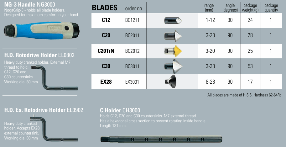 Holds C12, C20 and C30 countersinks. M7 external thread.