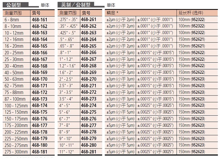 分辨率: 0.001mm, .00005"/0.001mm(測量范圍小于 4" 型號)