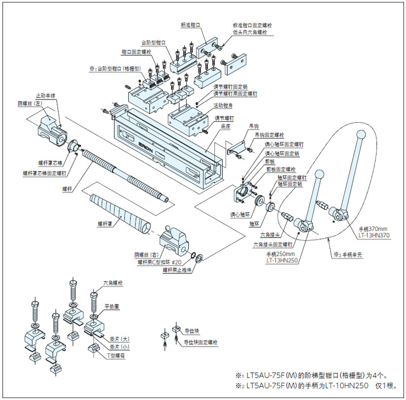 ![]() | 臺階型鉗口(格柵型)LT5AU-75SJG-8(2個1組)·····2組 臺階型鉗口(深20)LT5AU-75SJ-20(2片1組)·····1組 臺階型鉗口(深30)LT5AU-75SJ-30(2片1組)·····1組 標準安裝夾具套裝 BCS14Q1(2組1套)·····2套 標準導(dǎo)位塊 LT14-14(2個1組)·····1組 標準手柄 LT-10HN250······1根 |