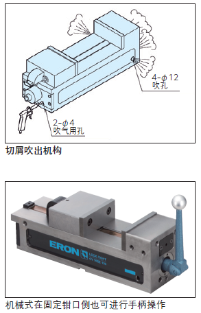 | 結(jié)構(gòu)特點 ●只要型號相同,并排配置精度均在0.01以內(nèi)。(全品標準并排配置規(guī)格) ●采用卷繞式切屑罩,可防止切屑進入底座。 ●采用防上浮機構(gòu),可防止工件上浮。 ●精度優(yōu)于原JIS 0級。 ●滑動面采用火焰淬火(HRC45),耐磨損性優(yōu)異。 ●底座為可鍛鑄鐵制,夾緊時不會發(fā)生彎曲、損壞。 ●底座與固定鉗身采用一體化結(jié)構(gòu),確保了高剛性。 ●與同級別的平口鉗相比,具有近2倍的鉗口張開度,可夾緊大型工件。 ●鉗口高度大,高工件也可牢靠夾緊。 ●配備有壓力補充機構(gòu),可作為壓力降低時的應(yīng)急措施,不會影響正常運行。 ●采用切屑吹出機構(gòu),進入底座的切削液及細小切屑也可從吹孔排出。 ●機械式在固定鉗口側(cè)也可進行手柄操作,而LTCV-TH可在液壓內(nèi)置式的固定鉗口側(cè)進行手柄操作。 由于固定鉗口側(cè)距作業(yè)人員近,工件裝拆距離短,因此可縮短設(shè)置時間、減輕作業(yè)人員的負擔。 ●SJ型(LTCV-S,SH)將標準型(LTCV,LTCV-H)鉗口更換成為臺階型鉗口。 | ![]() |